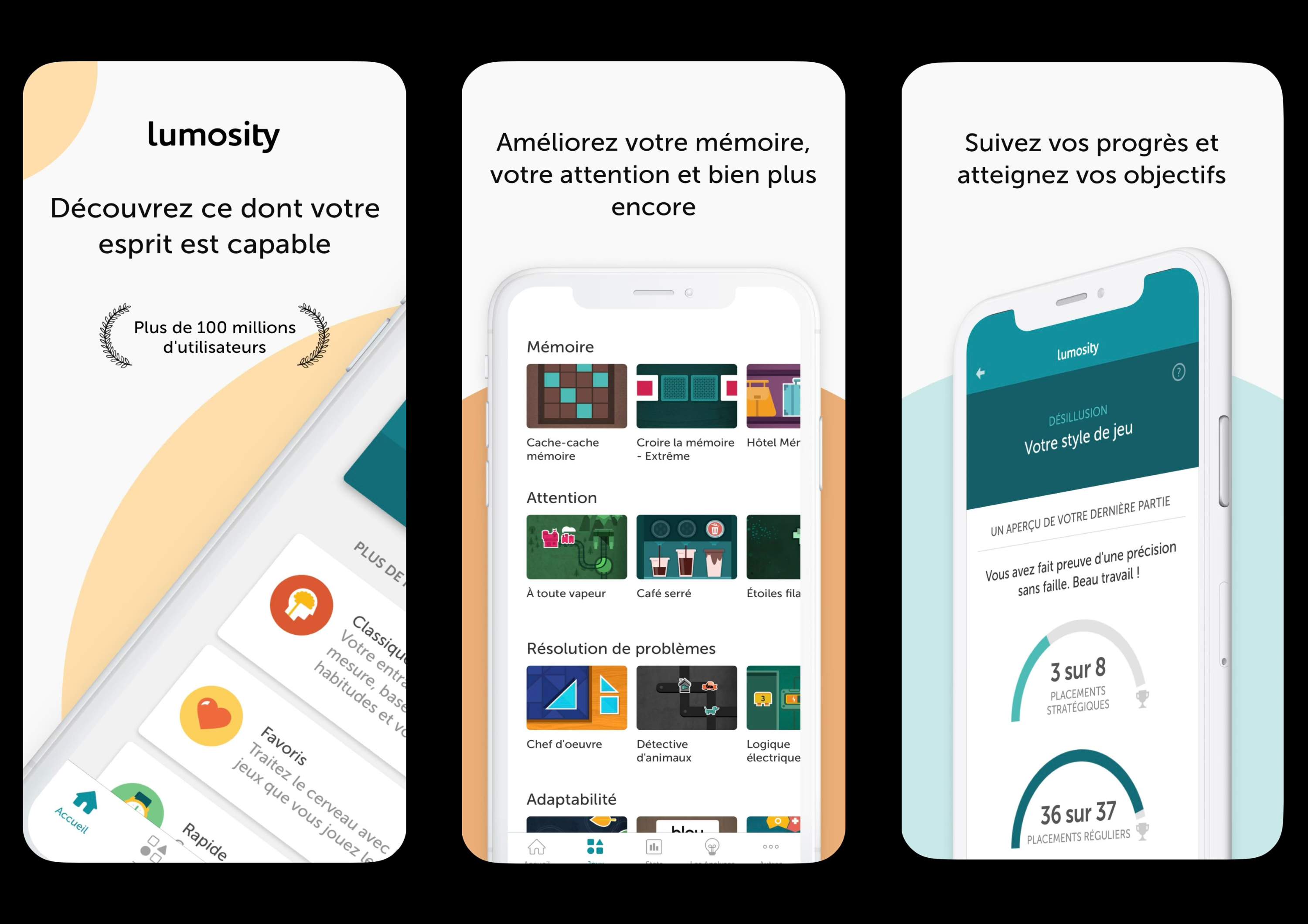 Développée en collaboration avec plus de 40 chercheurs en neurosciences et en psychologie, l'application Lumosity propose une approche ludique et personnalisée de l'entraînement cérébral. Utilisée par plus de 100 millions de personnes dans le monde, cette application offre chaque semaine des jeux gratuits. L'intégralité du contenu est proposée sur abonnement.