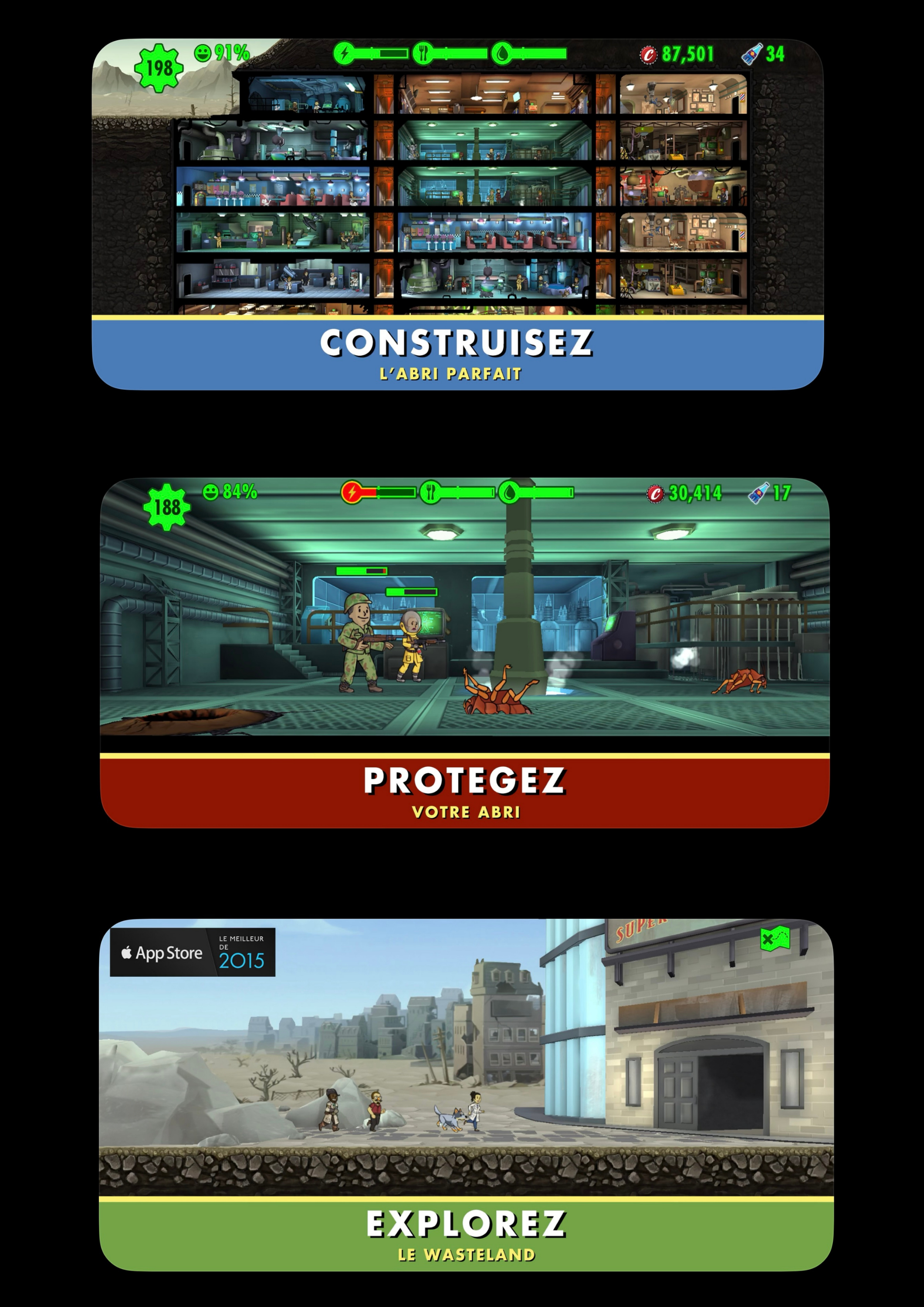 Fallout Shelter vous met aux commandes d’un abri souterrain post-apocalyptique, dans lequel vous gérez chaque détail de la vie de ses habitants : la production de l’eau, de l’électricité, de la nourriture, la reproduction, l’affectation des tâches, la formation, puis l’exploration à l’extérieur à la recherche de ressources et d’équipements.